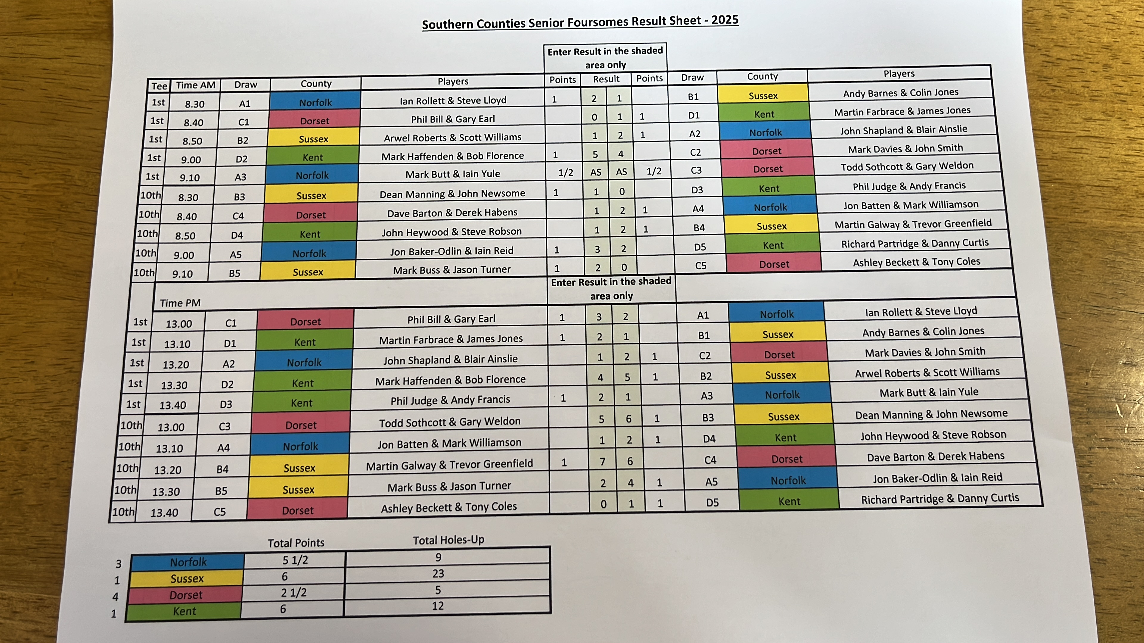 The afternoon matches brought a dramatic swing in fortunes. Norfolk, despite their strong start, managed to add just one point, while both Kent and our side rallied with three points apiece. That left the final outcome to be decided on holes won against Kent, where our team came through superbly with a total of 23 holes up across the board with some impressively large wins.